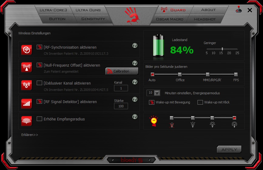 Im Ultra Core 3 ist das Headshot-Feature freigeschaltet. Damit kann automatisch der Rückstoß von Waffen in Spielen ausgeglichen werden. Hierfür sind verschiedene Modi verfügbar, beispielsweise als Feuerstoß oder im Dauerfeuer jeweils in unterschiedlichen Feuerintervallen. Sowohl auf der X- als auch der Y-Achse kann der Rückstoß ausgeglichen werden. Da sich alle Waffen unterschiedlich verhalten (sollten), sind mehrere Waffenprofile notwendig. Ist kein vordefiniertes Profil vorhanden, muss selbst eines erstellt oder auf Online-Plattformen danach gesucht werden. Für Ungeduldige ist eine quick-and-dirty-Lösung vorhanden, die direkt im Spiel definiert werden kann. Zudem sind in diesem Modus komplexe Makros verfügbar, die auf die Tasten gelegt werden können. Die Makros können auch Tastenanschläge, Schleifen und sogar Wenn-dann-Bedingungen beinhalten. Eine Sniper-Taste zur temporären Verringerung der CPI kann auch definiert werden. Im letzten, dem Ultra-Core-4-Modus, können besonders leicht Makros aufgenommen werden. Dies bietet sich beispielsweise für MMOs an. Ein Wechsel zwischen den Core-Modi dauert knapp über 20 Sekunden und ist nur direkt über die Software möglich. Ultra Core 3 und 4 sind nur bei der aktivierten Version RT5A möglich. Zu guter Letzt können drei verschiedene Profile eingestellt werden. Das Bloody-Logo leuchtet dann je nach Profil auch grün oder gelb.