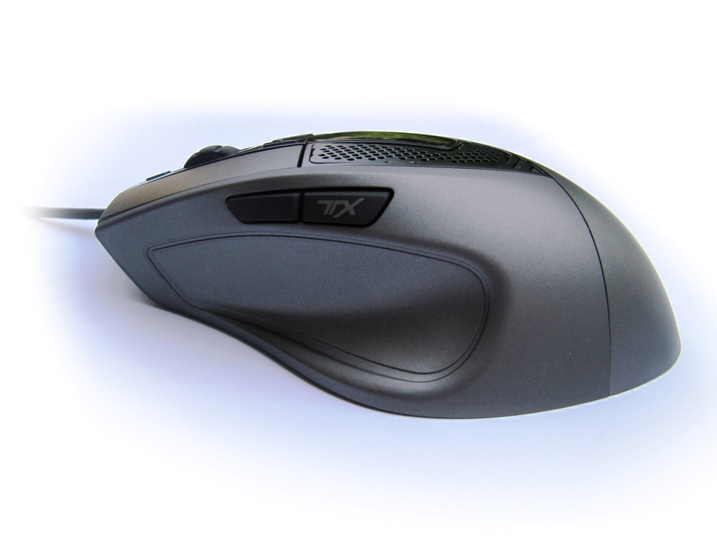 Die Maus ist fast komplett in Kunststoff gehalten, die Tasten bieten guten Halt. Im Daumenbereich ist die Oberfläche sehr glatt. Neben der üblichen linken und rechten Maustaste und dem Mausrad hat die Maus fünf weitere Tasten: zwei beim Daumen, zwei hinter und eine vor dem Mausrad. An den Tasten selbst gibt es nichts auszusetzen, das Mausrad hat allerdings Spiel zur Seite und rastet dort mit einem hörbaren Klicken ungewollterweise ein.