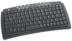 Die erwähnte Tastatur der Gyration Go 2.4 Air Mouse & Keyboard Suite kommt mit deutlich reduzierten Abmessungen daher, bringt aber dennoch insgesamt 105 Tasten inklusive zahlreicher Zusatzfeatures mit sich. Anders als Cherry, haben sich die Entwickler bei Gyration nicht zur grundsätzlichen Veränderung des Layouts der Tasten entschieden, sondern alle Elemente im Wesentlichen an ihren gewohnten Plätzen belassen. So findet man wie bei einer Fullsize-Tastatur die F-Tasten am oberen Ende des Eingabegeräts - auf den ersten Blick ein klarer Vorteil gegenüber der Cherry-Variante. Grundsätzlich erinnert das ganze ein wenig an den Aufbau einer Notebooktastatur, was der Einsatz einer so genannten Fn-Taste nochmals unterstreicht. Um einen lückenlosen Betrieb als Media-Center Eingabegerät zu ermöglichen, haben die Ingenieure von Gyration weitere Zusatz- und Multimediatasten integriert.