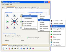 Mit der Software GyroTools GO gibt Gyration dem gesamten Set ein sehr mächtiges Werkzeug an die Hand und geht dabei sehr stark auf die Individualisierung der Maus ein. So findet man am unteren Ende der GyroTools GO Software eine Palette fertiger Funktionalitäten die man via Drag´n´Drop "auf die Maus ziehen kann". Beispiel: Die Registerkarte "Bewegungen" bietet die Möglichkeit bis zu acht verschiedene Aktionen in verschiedenen Himmelsrichtungen zu definieren. Durch das Einrasten der Gyro-Funktion und das anschließende Blockieren der Mitteltaste stehen diese Funktionen nun zur Verfügung und können durch das Bewegen der Air Mouse in die jeweilige Richtig benutzt bzw. aktiviert werden - simple Programmstarts sind ebenfalls möglich. Ein weiterer wichtiger Bestandteil der Software ist der Punkt "Hotspots": Hier lassen sich bestimmte Bildschirmbereiche definieren in denen wiederum vordefinierte Aktionen ausgeführt werden sollen. Zum Beispiel kann man in der oberen linken Ecke des Bildschirms ein Quadrat von 50x50 Pixel für den Start des persönlichen Browsers festlegen. Eine weitere Option ist das Textmarker-Tool, mit welchem man Dinge in verschiedenen Farben auf dem Bildschirm markieren kann. Durch die zahlreichen Möglichkeiten wird die Air Mouse von Gyration zum echten Kracher bei Präsentationen!