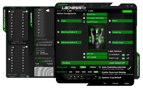 Hinsichtlich der Software gibt es bei der Lachesis wie inzwischen bei Razer üblich neben dem Treiber auch die Möglichkeit, die Firmware upzudaten. Zum Zeitpunkt unseres Tests lagen bei Treiber und Firmware jeweils die 1.0-Versionen vor - neuere Versionen sind zur Zeit noch nicht erhältlich. Somit decken sich die bei Razer zum Download bereitgestellten Versionen mit denen des Auslieferungszustandes der Lachesis.