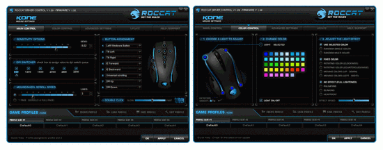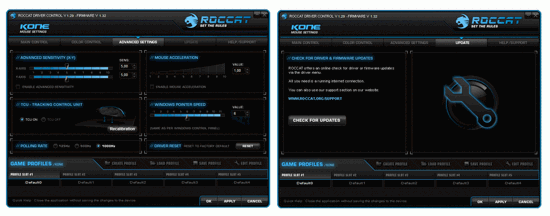 Die beiden letzten Tabs „Update“ und „Support“ bieten die Möglichkeit, die Treiberversion online zu überprüfen sowie die Support-Seite von Roccat aufzurufen. Das untere Feld des Hauptfensters bietet 5 Profil-Slots, die mit jeweils individuellen Mausprofilen belegt werden können. Diese können dann gespeichert und bei Bedarf sehr schnell abgerufen werden, denn man muss lediglich einen der Profil-Slots auswählen, den „Apply“-Button betätigen und schon wird das Profil geladen. Es kann allerdings ein paar Sekunden dauern, bis die Maus die neuen Einstellungen annimmt.
