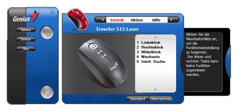 Der Maus liegt eine Treiber-CD mit der sog. IoCentre-Software für die Traveller 515 bei. Allerdings entschieden wir uns, den neusten Treiber mit der Versions-Nummer 1.2.5 von der Genius-Homepage herunter zu laden. Nachdem die Maus an den Rechner angeschlossen ist, wird sie zunächst als Standard-Maus erkannt. In diesem Modus funktionieren nur die drei Haupttasten, man muss für den vollen Funktionsumfang also den Treiber installieren. Nach der Installation des Treibers muss der Rechner neu gestartet werden und dann kann es mit der Konfiguration losgehen. Die Genius-Software legt ein Icon in der Schnellstartleiste an, so dass man direkt darauf zugreifen kann. Danach erscheint das kompakte Hauptfenster des Treibers, das in Flyouts angelegt ist. Zur Konfiguration muss man diese also öffnen. Klickt man auf das Maussymbol im Hauptfenster rechts, kann man auf die einzelnen Unterpunkte zugreifen. Das Werkzeugsymbol bietet den Zugriff etwa auf die Spracheinstellungen oder das Taskleistensymbol des Treibers. Angenehm ist auch, dass man den Skin der Treibers selbst auswählen kann, wobei drei verschiedene Farbvarianten zur Auswahl stehen.