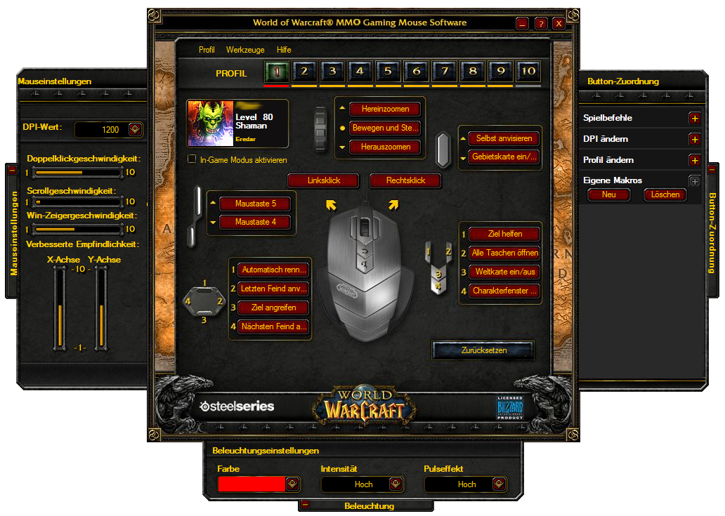 Die 15 MB große Software ist, wie auch die Maus, im WoW-Stil gehalten und vollständig darauf abgestimmt. So können wir hier 10 charakterspezifische Profile festlegen. Hierfür gibt man Realm sowie Charakternamen und Kontinent ein und erhält automatisch Klasse und Level des Charakters angezeigt. Die Profile beinhalten nicht nur die Tastenbelegung sondern auch Einstellungen wie dpi-Werte, Beleuchtung, Zeigergeschwindigkeit oder Scrollgeschwindigkeit. Einstellungen zur Mausbeschleunigung haben wir im Treiber leider vermisst. Allerdings lassen sich die Empfindlichkeiten für beide Achsen getrennt einstellen.