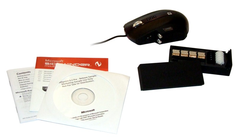 Nach dem Auspacken fällt zunächst der Lieferumfang auf, der sich auf hohem Niveau bewegt. So finden wir neben einer Kurzanleitung und der Treiber-CD eine solide, gummierte Kunsstoffbox im Lieferumfang, die die Gewichte und die Ersatzmausgleiter enthält. Zusätzlich fungiert die Gewichtsbox auch als Kabelhalterung, in die das Mauskabel eingelegt werden kann, um zu verhindern, dass es beispielsweise vom Schreibtisch rutscht. Diese Idee ist nicht schlecht, denn sie erspart zusätzliche Mouse-Bungees oder ähnliches. Das Kabel selbst ist mit knapp 2 Metern Länge sehr üppig ausgefallen, was aber kein Fehler ist. Hinsichtlich der Gleiter sind drei verschiedene Sätze beigegeben, die aus unterschiedlichen Materialien bestehen – eines der Sets ist aus Teflon. Hier muss man also ausprobieren, mit was am ehesten zu Recht kommt. Die Formgebung der SideWinder sticht durchaus aus der Masse hervor. So ist sie insgesamt sehr lang gezogen und läuft nach vorne relativ flach aus. Links finden sich die Daumentasten, die beide aus Aluminium bestehen, sehr gut erreichbar sind und mit einem guten Druckpunkt verwöhnen. Diese Anordnung bedingt es aber, dass man die Maus auf der linken Seite gewissermaßen nach außen bauen musste, denn das Display und die Daumentasten wollen untergebracht werden. Auf der rechten Seite findet sich ebenfalls eine Ausstülpung, die u.a. den Slot für die Gewichtskassette enthält. Durch diese Maßnahmen ist der Mauskörper deutlich wuchtiger, als man es etwa von den älteren Razer oder MS-Mäusen kennt. Hinsichtlich der Abmaße nähert sich die SideWinder der Logitech G5 an. Allerdings erzwingen natürlich allein schon die Zusatzgewichte einen größeren Mauskörper.