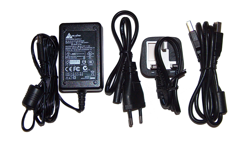 Anschlussseitig beschränkt man sich bei dieser Serie auf das Nötigste und so findet man als Übertragungsart lediglich USB 2.0 auf der Rückseite, an der sich auch ein Ein-/Ausschalter sowie der Stromanschluss für das externe Netzteil befindet. Letzteres besteht aus zwei Einzelteilen, so dass es auch möglich ist, andere Steckerarten ohne Adapter zu verwenden, was sich gerade für Auslandsreisen als sehr praktisch erweisen kann. Passend dazu wird neben dem obligatorischen Stecker-Typ C (CEE 7/16, Eurostecker) auch gleich ein Stecker-Typ G mitgeliefert, der exklusiv in Großbritannien, Irland, Singapur oder auch Malaysia genutzt wird und in zahlreichen weiteren Ländern vorkommen kann. Die maximale Gesamtlänge des Kabels beträgt bezogen auf Deutschland 2,4 Meter, während das ebenfalls mitgelieferte USB-Kabel (A-B) mit einem Meter Gesamtlänge auskommen muss.