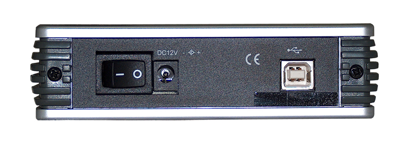 Als Verbindung zum Computer dient bei dieser Serie ausschließlich ein USB2.0-Anschluss an der Rückseite, an der sich auch ein Ein-/Ausschalter und der Stromanschluss für das externe Netzteil befindet. Letzteres kommt mit einer Maximallänge von immerhin 1,8 m daher, während auch hier ein nur 1,0 m kurzes USB2.0-Kabel beigelegt wurde.