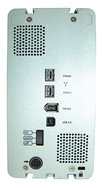Als Verbindungsmöglichkeiten zum Computer stehen USB 2.0, FireWire 400 und FireWire 800 zur Verfügung und auch bei dieser Serie von externen Datenträgern wurden sämtliche Anschlüsse wieder auf der Rückseite des Gehäuses angeordnet. So ist es nicht verwunderlich, dass dort neben sämtlichen Datenanschlüssen auch der Stromanschluss für das externe Netzteil sowie der bislang einzige Ein-/Aus-/ Autoschalter des gesamten Testfeldes zu finden sind. Letzterer kann auf der Automatikposition die Festplatten im Standby belassen, solange keine Datenleitung zum Computer besteht.