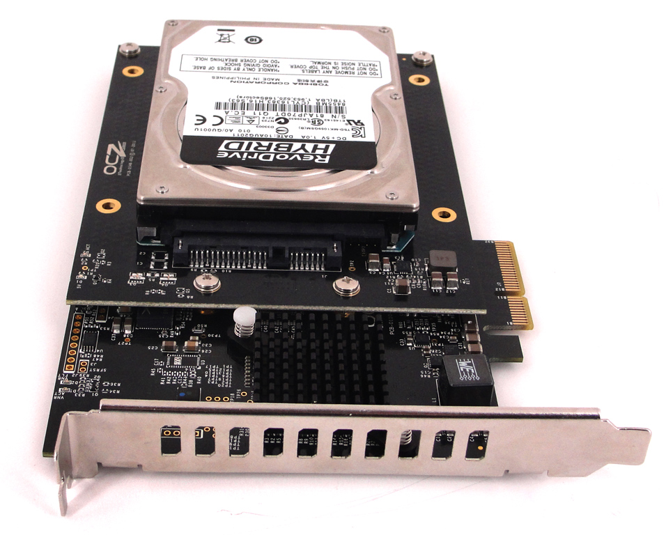 Als konventionelle HDD im Hybrid-System kommt eine Toshiba MK1059GS zum Einsatz, die mittels eines zusätzlichen Daugtherboards aufgesteckt wird und so für eine Bauhöhe von zwei Erweiterungsslots sorgt. Dabei handelt es sich im Detail um eine 1 TB Festplatte im 2,5 Zoll Formfaktor, deren einzelne Platter (Scheiben) mit 5400 Umdrehungen pro Minute drehen. Beide Laufwerke (Caching-SSD und HDD) werden über den SuperScale-Controller in einem RAID0-Verbund betrieben und sorgen für die theoretisch möglichen, hohen Datenraten von bis zu 910 MB/s lesend sowie 810 MB/s schreibend – optimale Kompression der Daten vorausgesetzt. Die maximal möglichen IOPS für das RevoDrive Hybrid gibt OCZ mit 120.000 (max. Random 4K schreibend) bzw. 65.000 (durchschn. Random 4K schreibend) an. Weitere wesentliche Komponenten finden wir auf dem PCB unseres Testprobanden nicht vor, da die SandForce-Controller typischerweise ohne externen Pufferspeicher (z.B. ein DRAM) auskommen.