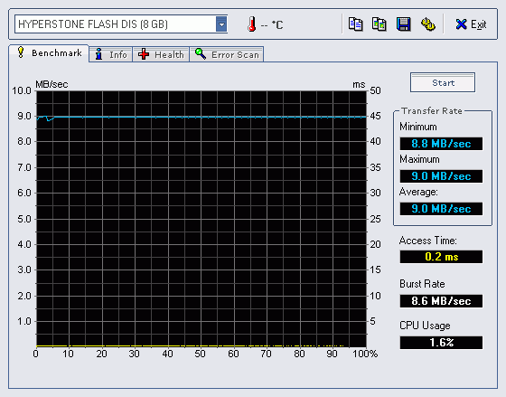 Im Normalfall werden für einen Schreibzyklus bei Flash-Speichern nur zwischen 1 µs und 1 ms benötigt. Dementsprechend fiel auch unser Messergebnis aus: HD Tune gab als Mittelwert sehr gute 0,2 ms aus. Die vom Hersteller versprochene UDMA66-Kompatibilität konnten wir allerdings nicht verifizieren - auch genannte 16,6 Mbyte/s (PIO Mode 4) haben wir im Praxistest nicht erreicht. Die Datentransferrate (im Folgenden Transferrate genannt) lag im Mittel bei knapp 10 Mbyte/s.