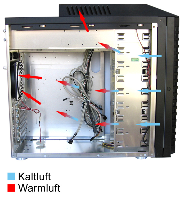 Nach dem Erwärmen der angesaugten Luft durch die verbauten Hardwarekomponenten, wird über zwei weitere Lüfter die Warmluft nach Außen abgegeben. Hierzu dienen ein 120 mm Lüfter an der Gehäuserückseite und ein 140 mm Lüfter an der Oberseite (ebenfalls an Lüftersteuerung angeschlossen), direkt unter dem stylischen Gehäuseaufbau samt Front-Panel. Durch diese Konstruktion will Lian Li einen effektiven Luftstrom um den verbauten Prozessor samt Netzteil schaffen, die beide zu den temperatur-kritischen Komponenten in einem aktuellen PC-System zählen. Aufgrund der Position des hinteren Lüfters werden die Grafikkarten leider nur an der Oberseite und damit nicht auf der Seite des Kühlkörpers, mit Frischluft umgeben. Dieses Faktum gehört leider zu den traditionellen Problemstellen beim ATX-Standard, der man durch eine geänderte Anordnung bei BTX entgegenwirken will. Das Prinzip der Kühlung und den optimalen Luftstrom im Lian Li PC-P60 Armorsuit zeigt die obere Grafik.