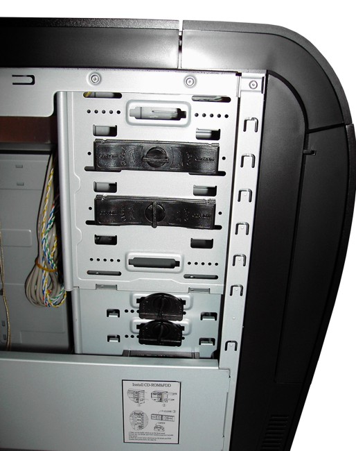 Danach können die 5,25"-Laufwerke eingebaut werden. Das funktioniert gut, allerdings müssen die Bruchränder der Stahlabdeckungen vorher plan gefeilt werden, denn andernfalls zerkratzt man die Laufwerke beim Einschieben. Nun müssen die Laufwerke exakt zu den Befestigungslöchern im Gehäuse ausgerichtet werden. Hier kommt eines der wirklich gelungen Features des Pininfarina zum Einsatz, denn das schraubenlose Bajonett-System funktioniert einwandfrei. Das Laufwerk muss lediglich passend eingeschoben werden, anschließend wird der Halteclip in die Befestigungslöcher gedrückt und verriegelt – fertig. Dadurch wird das Laufwerk an die gegenüberliegende Seite des Laufwerksschachtes gedrückt und fixiert. Ebenso einfach geht der Einbau des 3,5"-Diskettenlaufwerkes von der Hand. So wünscht man sich schraubenlose Systeme. Bei der Montage der Fan-o-Matic erlebten wir allerdings, dass das System nur bei Standardgeräten wirklich funktionell ist. Die Lüftersteuerung läßt sich zwar auf die gleiche Weise einbauen, aber da sie aufgrund ihrer Länge nur den halben Schacht belegt, wird sie auf der anderen Schachtseite nur unzureichend fixiert. Das resultiert im Ergebnis, dass man die Steuerung bei jeder Tastenbetätigung ins Gehäuse drückt. Hier wäre also die zusätzliche Möglichkeit, die Komponenten auf der dem Schnellverschluss gegenüberliegenden Seite noch verschrauben zu können, sinnvoll gewesen. Dennoch funktioniert das System insgesamt gut.