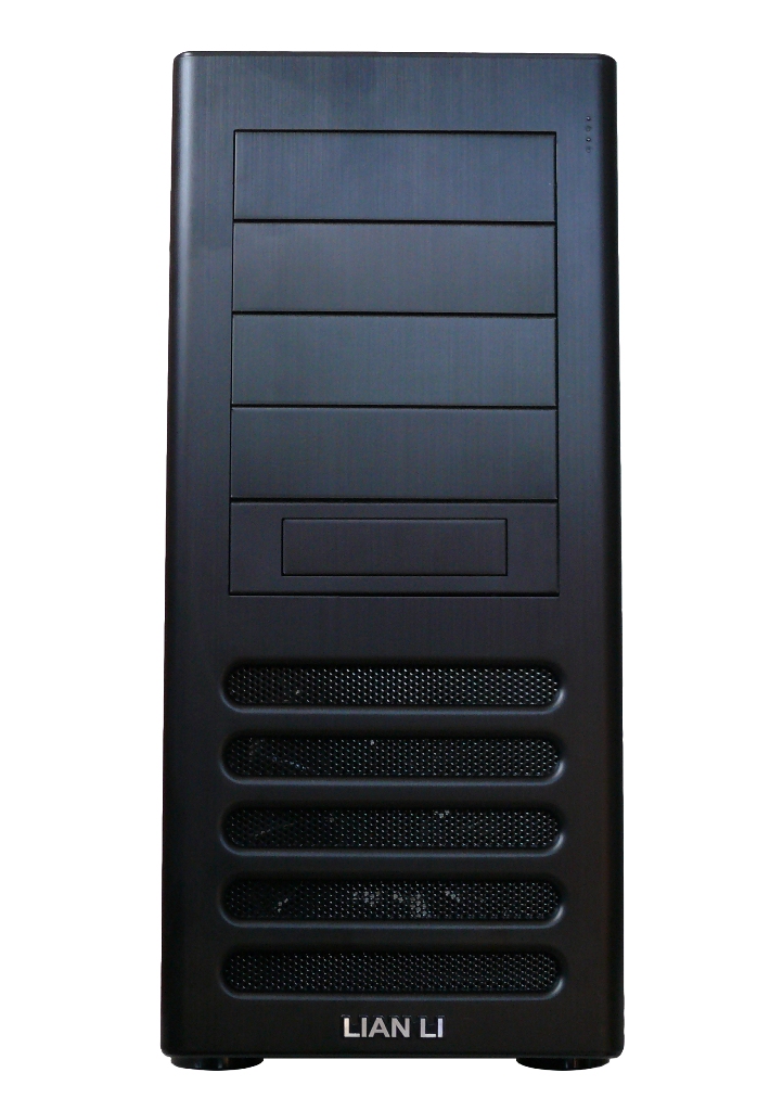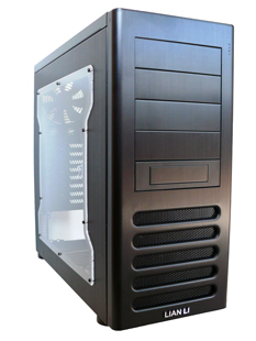 An der Oberseite des Gehäuses befindet vorne, nebst dem Power- und dem Reset-Taster, ein eSATA-Anschluss, die Audio-Ports (2 x 3,5 mm Klinke) sowie eine Besonderheit des Gehäuses, zwei Front-USB des Standards 3.0. Da die Lian Li-übliche Abdeckung in der neuen Serie nicht mehr vorhanden ist, kann gegebenenfalls Staub in die Anschlüsse eindringen. Für viele ältere Lian Li Gehäuse gibt es allerdings Front-Panels mit USB 3.0 zum nachrüsten. Power- und Reset-Taster sind blau bzw. rot beleuchtet, wenn sie an den Pins der Status-LEDs befestigt werden. Weiter hinten befindet sich an der Oberseite eine Abdeckung, welche entfernt werden kann, um einen weiteren 140-mm-Lüfter zu montieren.
