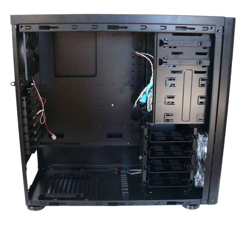 Beim Öffnen des Lian Li PC-7FNWX fällt wieder auf, dass das komplette Gehäuse schwarz eloxiert ist. Das Gehäuse ist für den Einbau von ATX- und µATX-Mainboards geeignet, ein Mainboardschlitten ist nicht vorhanden. Das Netzteil befindet sich unter dem Mainboard, davor der Festplattenkäfig. Die fünf 5,25"-Schächte über den vier Festplattenhalterungen vorne. Der Festplattenkäfig kann bei Bedarf um 90° gedreht werden. Durch den Festplattenkäfig ist die Länge der Erweiterungskarten auf 290 mm begrenzt.