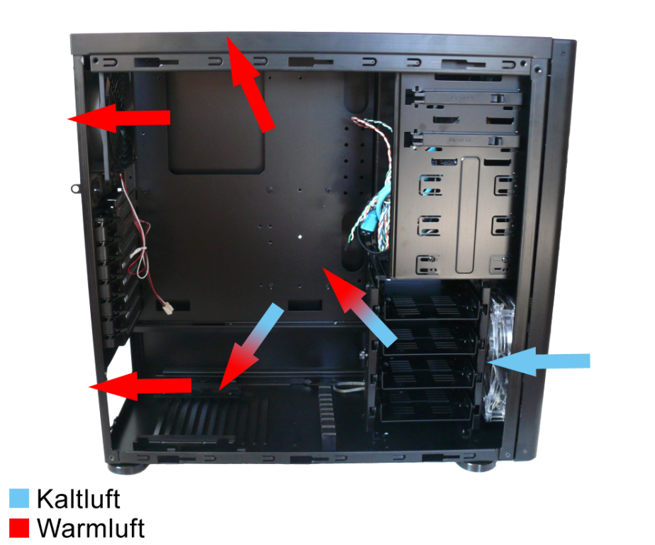 Die kühle Luft wird an der Front durch den 14-mm-Lüfter eingesaugt und erwärmt hinten durch den 120-mm-Lüfter wieder abgegeben. Es entsteht ein effektiver Luftstrom, vor allem bei Verwendung eines richtig ausgerichteten Tower-CPU-Kühlers. Die Slotblenden sind mit Löchern versehen um Grafikkarten mehr Luft bieten zu können. Das Netzteil saugt entweder kühle Luft vom Boden oder warme Luft aus dem Gehäuseinneren ab und befördert sie nach außen.
