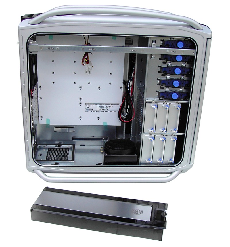 Der Mainboardtray ist im Auslieferungszustand mit einem großen Pappschild bedeckt, aus dessen Kennzeichnung sich ergibt, in welche Löcher die Abstandshalter abhängig vom Mainboardformat eingeschraubt werden müssen. Leider ist der Mainboardschlitten nicht ausziehbar, so dass der Zusammenbau im Gehäuse erfolgen muss. Das sollte auf Grund der großzügigen Dimensionen des Cosmos allerdings kein derart haarsträubendes Gefrickel wie bei Standardgehäusen werden. Dementsprechend verzichtet Cooler Master auch auf Adapterlösungen zur leichteren Verkabelung für die Frontanschlüsse, wie es etwa Lian Li gezeigt hat. Schön ist auch, dass Komponenten wie Grafikkarte, Soundkarte usw. mittels Rändelschrauben am Gehäuse befestigt werden. Das erspart Schraubenzieherakrobatik und sollte inzwischen eigentlich Standard sein. Rechts neben dem Mainboardtray finden sich auch die beiden ovalen Gehäusedurchlässe für die Kabel der Frontanschlüsse und der Festplatten. Somit soll hier die Möglichkeit geschaffen werden, die Kabel sauber im Gehäuse zu verstauen.