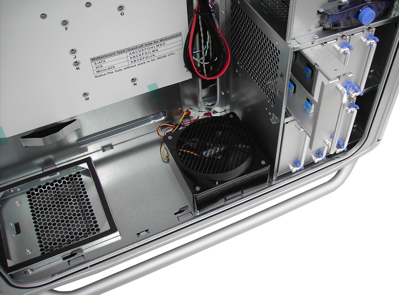 Deutliche Unterschiede gegenüber Standard-Gehäusen finden wir im Inneren des Cosmos. Zunächst ist die geänderte Anordnung der Komponenten zu nennen. Das Netzteil wird am Gehäuseboden eingebaut; man orientiert sich hier also am BTX-Standard. Dabei wird das Netzteil mit dem Lüfter nach unten direkt auf einen Rahmen im Inneren des Gehäuses gesetzt und soll im Idealfall so mit dem gummierten Rahmen abschließen, dass nur Außenluft durch das Netzteil angesaugt wird. Sinn dieser Maßnahme ist es, dass das Netzteil direkt gekühlt wird, statt die warme Luft aus dem Gehäuse abzusaugen und sich damit zusätzlich aufzuheizen. Natürlich dient ein Netzteil mittlerweile auch der zusätzlichen Entlüftung des Gehäuses, aber diese Aufgabe wird durch die beiden im Gehäusedeckel verbauten 120 mm-Lüfter übernommen. Das kommt einem leisen Betrieb des Rechners natürlich entgegen, denn ein kühleres Netzteil arbeitet gewöhnlich mit niedrigeren Drehzahlen des Lüfters.