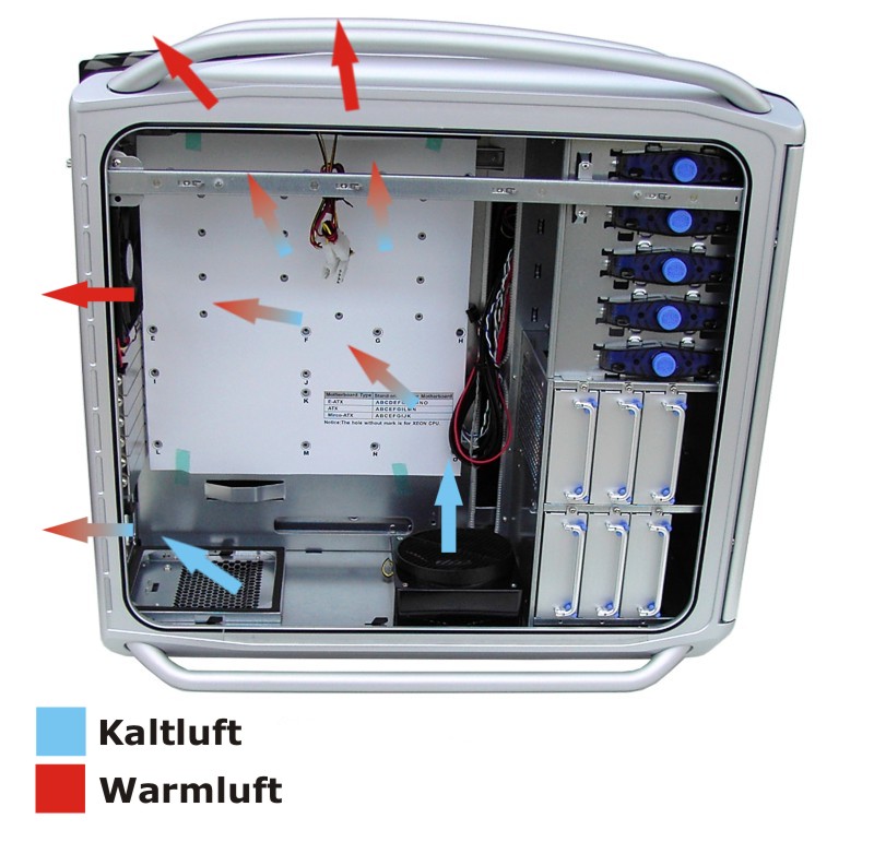 Soweit die Theorie. Da Gehäuse bzw. deren Konzepte allerdings nicht nur in der Theorie funktionieren sollen, sondern sich im praktischen Alltag bewähren müssen, haben wir uns mit dem Kühlsystem des Cosmos eingehend befasst. Grundsätzlich geht inzwischen bei Gehäusen der Trend von 80 mm-Lüftern weg und hin zu 120 mm-Lüftern oder noch größeren Modellen. Dies liegt darin begründet, dass mit steigender Wärmeentwicklung von den Lüftern höhere Drehzahlen gefordert werden, damit die Kühlleistung ausreicht. Gleichzeitig steigt damit der Geräuschpegel gewaltig. Diese unangenehme Erfahrung kann man oft als Besitzer einer aktuellen Grafikkarte machen. Das muss aber nicht notwendigerweise ein Argument gegen die Luftkühlung sein, sofern sich die Lüfter vernünftig regeln lassen und dabei noch genügend Leistung liefern, denn die Wasserkühlung ist noch lange nicht so weit vereinfacht, dass sie auch von unerfahrenen Anwendern problemlos genutzt werden kann.