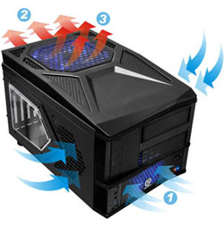 Auf der nächsten Seite möchten wir uns ausführlich der Installation der Komponenten ausführlich widmen. Zuvor erhalten Sie jedoch anhand der untenstehenden Tabelle eine Übersicht über die technischen Daten des Gehäuses. Das Gehäuse ist für Micro-ATX- und Mini-ITX-Boards ausgelegt und hat die Maße 266 x 291 x 465 mm (H x B x T). Es wiegt ohne Komponenten 6,7 kg und ist damit für den Einsatz auf einer LAN-Party durchaus geeignet. Neben dem schicken Seitenfenster, das einen Einblick in das Gehäuse-Innere erlaubt, sind besonders die vier vorinstallierten Gehäuselüfter lobend zu erwähnen – diese sorgen mit ihrer blauen LED-Beleuchtung für das nötige Flair auf jeder LAN-Party. Daraus ergibt sich ein von Thermaltake entwickelter Luftstrom, wie in der nebenstehenden Grafik verdeutlicht. Folgende Lüfter sind mit im Lieferumfang: