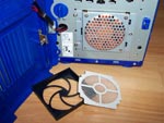 Nun hier zum wohl interessantesten Teil des Artikels: Zu den Extras zählen unter anderem die beiden Lüftersteuerung - eine in der Fronttür mit lediglich zwei Potis und der Thermaltake Hardcone. Dann natürlich noch die Leuchtschrift an der Front, die wahlweise immer leuchtet oder in drei Stufen blinkt, wobei dies dann auf Dauer auch nervig sein kann. Die fünf mitgelieferten Gehäuselüfter, alle aus dem Hause Thermaltake, sind alle mit weniger als 21 dB angegeben. Dies erweist sich auch als korrekt, die Lüfter sind relativ leise, wobei dies nicht leicht zu bewerten ist, denn jeder hat eine eigene Auffassung von Silent oder Normallautstärke. Zwei der 92 mm Lüfter sind aus klarem Kunststoff gefertigt und mit blauen LEDs versehen. Die in der Fronttür verbauten Potis sind mit einem zweiten Kabel mit den steuerbaren Lüftern verbunden. Alle mitgelieferten Lüfter haben einen 4-Pin Molex-Netzteil Stecker und ein extra Lüftersignalkabel, somit müssen sie nicht den Strom vom Mainboard beziehen, können aber dennoch ein Signal senden, welches die momentane Umdrehungszahl beinhaltet. In das X-förmige Window ist der Firmenname Thermaltake eingraviert, der bei richtiger Beleuchtung blau erscheint. Die PCI- und AGP-Steckplatzbefestigungen sind wie beim Casetek 1018 mit kleinen Klammern versehen, für den Schraubenlosen Tausch von Karten. Leider ist dieses System bei etwas breiteren Platinen nicht mehr einsatzfähig und muss komplett entfernt werden.