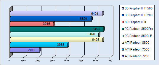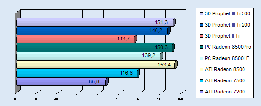 Die folgenden Diagramme sollen die Leistungen der Karten wiederspiegeln. Als Vergleichwerte wurden die bereits getesteten Hercules Titanium Karten verwendet. Zu jedem Benchmark-Programm wurden jeweils zwei Diagramme (für 1024 und für 1280) erstellt. Das erste der Beiden zeigt die Werte in 1024x768...