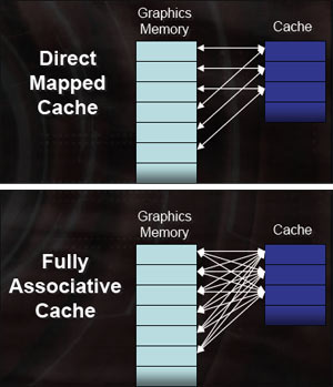 Ansonsten hat man auch die Flexibilität interner Caches (Texture, Color, Z und Stencil) deutlich erhöht, was sich nun als "Fully Associaive Cache" bezeichnen lässt und zuvor nur den Namen "Direct Mapped Cache" verdient hatte. Konkret können die verschiedenen Areas der Caches nun auf jeden beliebigen Bereich im externen Videospeicher zugreifen und dadurch bisherige Latenzen klar minimieren - die folgende Skizze sollte dies verdeutlichen. ATi hat der R5xx Serie auch verbesserten Hierarchical Z Buffer und eine aufgewertete Z Compression verpasst.
