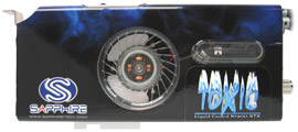 Auf den ersten Blick mag man gar nicht glauben, dass Hersteller Sapphire in gemeinsamer Entwicklung mit Kühlungsspezialist Thermaltake eine gesamte Wasserkühlung auf die Größe einer herkömmlichen Add-In-Karte geschrumpft hat, doch auch das nähere Hinsehen lässt keine Zweifel daran aufkommen. Die gesamte Konstruktion beherbergt einen Ausgleichsbehälter, eine 12V Mini-Pumpe und einen massiven Radiator - Installation via Slot-Bracket und PCI-kompatible Steckverbindung. Letzterer ist an die metallische Seite des Toxic-Gehäuses gekoppelt und erhält damit eine weitere Abfuhrmöglichkeit für die entwickelte Wärme. Inmitten des ganzen finden wir einen LED-Lüfter (Farbe: blau), der sich in zwei verschiedenen Stufen betreiben. Zwei Betriebsdrehzahlen ermöglichen wahlweise leiseren Betrieb oder höhere Leistung: 18 dBA bei 2000 U/Min bzw. 26 dBA bei 2500 U/Min. Als Redakteur und Anwender hätten wir uns an dieser Stelle eine stufenlose Regelung gewünscht - versierte Bastler und Hobby-Elektroniker können hier jedoch problemlos noch nachbessern und perönliche Vorlieben ins Spiel bringen.