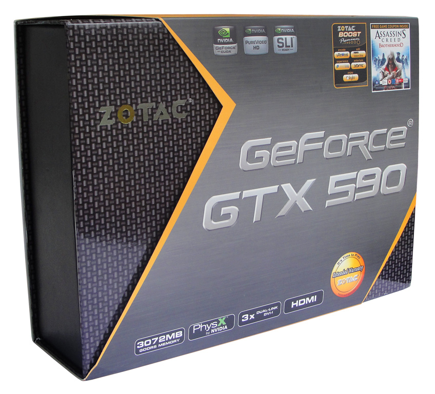 Bevor wir auf die technischen Daten der GeForce GTX 590-Grafikkarte eingehen, möchten wir kurz den Lieferumfang erläutern. Neben einem User's Manual finden wir in der Verpackung zwei Adapter für die Stromversorgung der Karte (Adapter von 2x-6-Pin auf 1x-8-Pin). Damit kann die Grafikkarte auch an einem Netzteil betrieben werden, das keine 8-Pin-PCIe-Anschlüsse besitzt. Außerdem hat ZOTAC einen DVI-VGA-Adapter in der Verpackung beigelegt und ermöglicht über ein DVI-HDMI-Adapterkabel den Anschluss von HDMI-Endgeräten an die GTX 590 Grafikkarte.