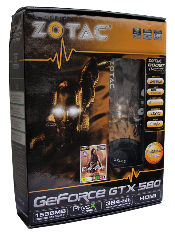 Bevor wir auf die technischen Daten der GeForce GTX 580-Grafikkarte eingehen, möchten wir kurz den Lieferumfang erläutern. Neben einem User's Manual finden wir in der Verpackung zwei Adapter für die Stromversorgung der Karte: Einen PCIe-Molex-Adapter (6-Pin) sowie ein Adapterkabel für den Anschluss einer 8-Pin-PCIe-Versorgung. Damit kann die Grafikkarte auch an einem Netzteil betrieben werden, das keine 8-Pin-PCIe-Anschlüsse besitzt. Außerdem hat ZOTAC einen DVI-VGA-Adapter und einen Adapter zum Anschluss von Standard-HDMI-Geräten an den verbauten Mini-HDMI-Port in der Verpackung beigelegt. Zusätzlich bereichert man den Kunden um eine Vollversion des PC-Spiels "Prince of Persia - The Forgotten Sands" und ZOTAC Boost Premium. Bei Boost handelt es sich um eine Sammlung verschiedener PC-Applikationen, die dem Anwender diverse Hilfsprogramme zur Verfügung stellen. Folgend der gesamte Lieferumfang auf einen Blick: