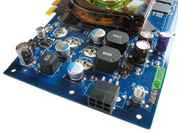 Für die Anbindung von Speicher bietet der Grafikchip ein 256 Bit breites Interface für GDDR3-Module. Den passenden Speicher liefert dabei ausnahmsweise nicht das Unternehmen Samsung, sondern Speicherspezialist Hynix. Die verbauten 1,4 ns Speicher (HY5AS573225A, Typ FP-14) erlauben theoretisch eine Frequenz von bis zu ca. 715 MHz und sollten dadurch noch etwas Potenzial für eine Erhöhung des Taktes bieten können. Ob es uns gelungen ist die nackten Chips (keine passive oder aktive Kühlung installiert) noch etwas zu beschleunigen, erfahren Sie bereits auf der nächsten Seite.