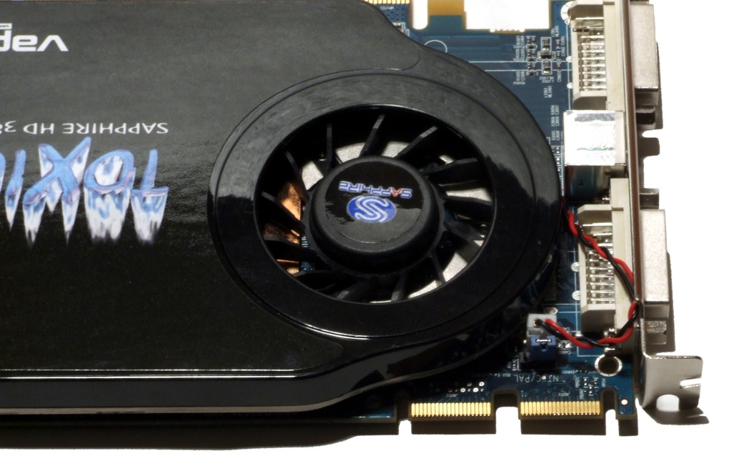 Der Radiallüfter, der Kühler für die Spannungswandler und der Stromanschluss der HD 3870 Toxic.