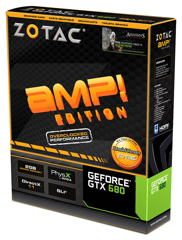 Bevor wir auf die technischen Daten der GeForce GTX 680 AMP! Edition von ZOTAC eingehen, möchten wir kurz den Lieferumfang erläutern. Neben einem Quick Installation Guide, einem ausführlicheren User's Manual und der obligatorischen Software- und Treiber-DVD, finden wir in der Verpackung zwei PCIe-Molex-Adapter (6-Pin) für die Stromversorgung der Karte. Damit kann die Grafikkarte auch an einem älteren Netzteil ohne entsprechende Anschlüsse betrieben werden. Außerdem hat ZOTAC einen DVI-VGA-Adapter der Verpackung beigelegt und bereichert den Kunden um Boost Premium. Bei Boost handelt es sich um eine Sammlung verschiedener PC-Applikationen, die dem Anwender diverse Hilfsprogramme zur Verfügung stellen. Um die neue Grafikkarte auch direkt in Aktion erleben zu können, liefert ZOTAC die GTX 680 inkl. neuem Dual-Silencer-Kühler mit "Assassin's Creed III" aus. Mit einem Case-Badge kann zudem das eigene PC-Gehäuse etwas verschönert werden. Folgend der gesamte Lieferumfang auf einen Blick: