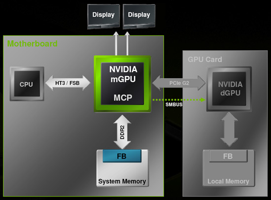 Wenn viel 3D-Performance benötigt wird, kommen je nach SLI-Konfiguration eines PCs eine oder mehrere Grafikkarten zum Einsatz. Bei weniger grafikintensiven Anwendungen, beispielsweise beim Abspielen von HD-Videos, bei E-Mail und Internet-Surfen, wird mit HybridPower die mGPU genutzt und die externe Grafik über den SMBUS abgeschaltet (angeblich 0 Watt Leistungsaufnahme bei Off-Modus). Das senkt natürlich die Hitzeentwicklung im Gehäuse, den Geräuschpegel und den gesamten Stromverbrauch enorm. Hiervon sollen künftig auch entsprechende Notebooks profitieren und nach Angaben von Nvidia steigt so die Akkulaufzeit um bis zu drei Stunden.