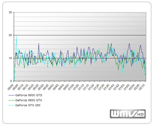 Ein wichtiger Punkt in unserem Benchmarkparcour ist auch die HDTV-Wiedergabe. So testeten wir, ob bzw. wie gut unsere Kandidaten WMV-Videos in HDTV-Qualität beschleunigen können. Aus dem folgendem Diagramm lässt sich deutlich erkennen, dass Hersteller Nvidia seine Hausaufgaben ordentlich erledigt hat. Für die Wiedergabe im Windows Media Player 11 nutzten wir ein WMV-HD-Video von Microsoft (To the limit) mit einer Spieldauer von 2:10 Minuten.