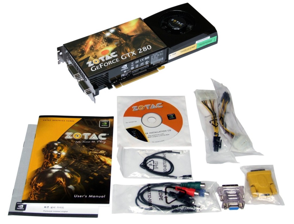Neben einer Treiber-CD, einer Schnellinstallationsanleitung und einem Handbuch findet sich in der Packung der Zotac-Karte weiteres Zubehör in Form von diversen Kabeln und Adaptern. Die im Handel erhältliche Version enthält darüber hinaus noch eine Vollversion des Spiels Racedriver Grid.