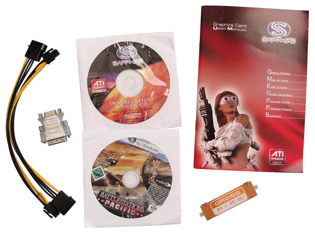 In der Full-Retail-Version der Vapor-X Radeon HD 5870 Grafikkarte von Sapphire befindet sich natürlich diverses Zubehör in der Verpackung. Dazu gehört neben der eigentlichen Grafikkarte ein Handbuch, eine Software- und Treiber-CD, eine CrossFireX-Brücke zum Aufbau einer Multi-GPU-Plattform mit mehreren Grafikkarten, ein DVI-VGA-Adapter und zwei Adapterkabel für die Stromversorgung (falls beim Netzteil nicht genug native Anschlüsse verfügbar sind). Des Weiteren hat man eine Vollversion des Spiels "Battlestations: Pacific" von Eidos Interactive beigelegt. Der gesamte Lieferumfang im Überblick: