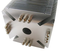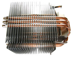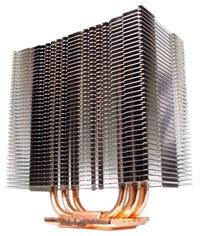 Bei den verwendeten Materialien unterscheidet sich der Ninja Kühlkörper nicht vom bereits oben behandelten Noctua NH-U12, dessen Heatpipes ebenfalls aus Kupfer und die Lamellen aus Aluminium gefertigt sind. Scythe setzt auf insgesamt sechs Kupfer-Heatpipes, verbunden mit der polierten Bodenplatte, welche die Wärme an 23 Lamellen abtransportieren. Die Abmessungen betragen 150 x 110 x 110 mm, bei einem Gewicht von 665 Gramm (ohne Lüfter). Mit montiertem Lüfter kommt der gesamte Scythe Ninja auf stolze 815 Gramm.