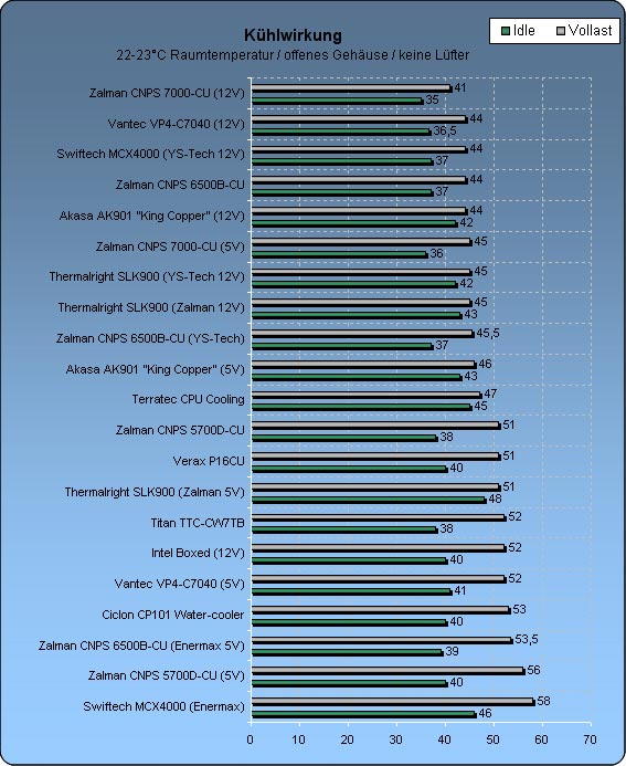 Im untenstehenden Diagramm (Angaben in °C) sind die Temperaturwerte des Verax P16Cu mit der gesamten Palette der von uns schon getesteten Kühlern verglichen, um die Leistung des Kühlers richtig einordnen zu können. Die zwei verschiedenen Kühlwerte je Kühler ergeben sich durch zwei unterschiedliche Bedingungen, zum einen bei Volllast und zum anderen im Leerlaufbetrieb (Idle). Da der Kühler einen temperaturgeregelten Lüfter besitzt und wirklich unhörbar leise ist, haben wir auf einen Testlauf unter 7 Volt verzichtet...