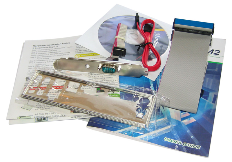 Der Lieferumfang der ECS-Platine fällt, wie man es von einem günstigen µATX-Mainboard erwartet, nicht so üppig aus. Neben nötigen Komponenten wie einem ATX-I/O-Shield, einer Treiber-CD und einem Handbuch samt Kurzanleitung, beinhaltet die Verpackung nur wenige weitere Elemente: Ein SATA-Kabel, ein IDE-Kabel und eine Slotblende zur Realisierung eines seriellen Anschlusses. Zwar handelt es sich um eine im Formfaktor beschnittene Platine die auch erwartungsgemäß in entsprechend kleineren Gehäusen zum Einsatz kommen wird, doch hätten wir uns ein wenig mehr vom Lieferumfang erhofft.