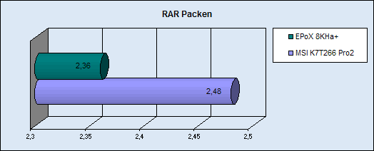 Das Mainboard ist sehr schnell, und vor allem im Bandwidth Test sieht man große Unterscheide zum MSI K7T266 Pro2. Aber auch in anderen Tests, wie zum Beispiel in der 3D Performance sieht man deutliche Unterschiede, die schon eine enormes Ausmaß haben, so ist das Testsystem mit fast 500 Punkten schneller was allein auf das Mainboard zurückzuführen ist. Als drittes Benchmark haben wir uns für das Packen einer 133 MB großen Datei entschieden um die alltags Performance zu testen. Auch hier sieht man, dass das Epox um ganze 12 sec schneller fertig ist. Und in allen Benchmarks das MSI K7T266 Pro 2 deklassiert wird.