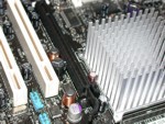 Als nächstes wollen wir uns mit dem Layout des Mainboards beschäftigen. Hierbei gibt es beim D925XECV2 so gut wie nichts zu bemängelt, wäre da nicht der überdimensionierte Aluminiumkühlkörper auf der Northbridge, der dem PCI Express Slot der Grafikkarte sehr nahe kommt. Für eine normale Grafikkarte kein Problem, dürfte so manche Heatpipe-Kühllösung hier nicht passen. Ein Ersetzen des Kühlkörpers dürfte ebenfalls schwer werden, da dieser auf dem Mainboard vernieten und nicht verschraubt oder gesteckt ist. Hier muss man bei eventuellen Vorhaben schon etwas mehr Aufwand in Kauf nehmen.