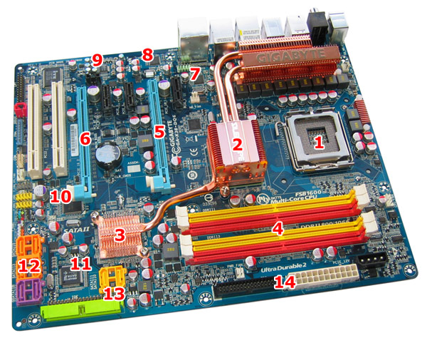 Im unteren Mainboardbereich befinden sich die Erweiterungsslots, die Southbridge, die Front-Panel-Anschlüsse, satte acht SATA2-Ports und der einzige IDE-Kanal, sowie Pins für die externen USB- und FireWire-Ports sowie den COM- und LPT-Anschluss. Unserer Meinung nach gibt es keine groben Fehler im Layout der Platine. Lediglich über die Aufteilung der PCI- und PCIe-Erweiterungsslots könnte man diskutieren, da im Falle eines Multi-GPU-Systems mit zwei Dual-Slot-Grafikkarten nur noch ein PCI-Steckplatz zur Verfügung steht. Eine Vertauschung mit den weniger genutzten PCI Express x1 Slots hätte hier Abhilfe schaffen können. Alternativ wäre auch eine Platzierung der PCI-Ports oberhalb der Grafikkarten möglich gewesen. Auf der folgenden Grafik haben wir nochmals alle wichtigen Stellen auf der Platine markiert und geben gleichzeitig einen kleine Übersicht zur Platzierung der einzelnen Chips und Funktionalitäten auf dem X38-DQ6 von Gigabyte.