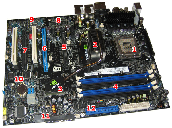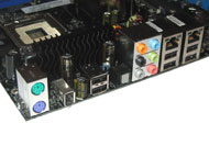 Ebenfalls in der oberen Boardhälfte befindet sich das Back-Panel (siehe Bild unten Mitte) mit direkt verdrahteten Anschlüssen für die PC-Rückseite. Von den insgesamt zehn USB 2.0-Ports hat EVGA hier direkt sechs Stück nach Außen geführt und auch einen der beiden FireWire-Anschlüsse integriert. Komplettiert wird das Ganze von den Audio-Anschlüssen samt optischem Ausgang, zwei PS/2-Ports für Maus und Tastatur sowie zwei Mal Gigabit-Ethernet. Der Serial-Port wird durch ein Slot-Bracket realisiert.