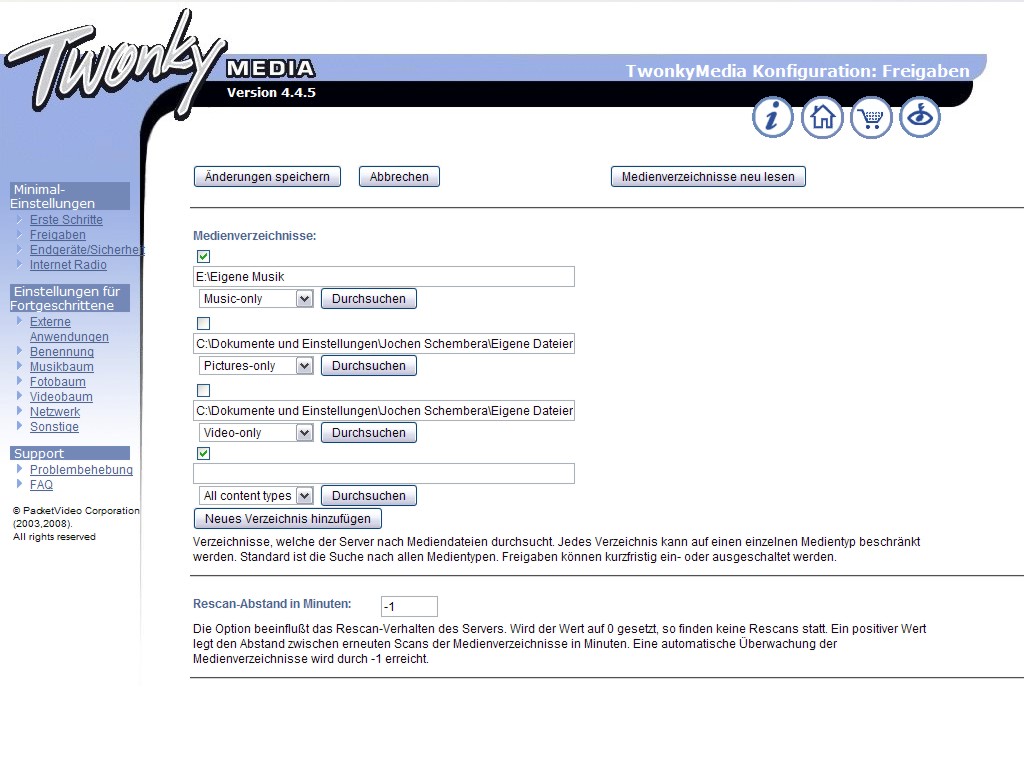 Nach der Installation der TwonkyMedia-Software kann diese aufgerufen werden und es erscheint ein Dialogfenster im Webbrowser. Hier müssen lediglich die fraglichen Ordner der Festplatte in das Dialogfenster eingetragen werden und werden vom NOXON auch sofort erkannt. Danach ist es problemlos möglich, die entsprechenden Inhalte auf dem iRadio wiederzugeben. Am Gerät selbst kann man mit der Fernbedienung wie gehabt durch die Ordner blättern oder mittels der Suchfunktion gezielt Titel usw. auswählen. Auch stehen verschiedene Kategorien, in der Software "Knoten" genannt, wie Interpret, Genre usw. zur Verfügung, die sich danach richten, wie diese vorher in der TwonkyMedia-Software benannt wurden. Weitere Titelangaben werden so angezeigt, wie sie etwa mittels des Windows Media Players oder des KM Players benannt wurden. Natürlich lassen sich die jeweiligen Titel auch als Weckmelodie verwenden, aber dazu muss der entsprechende Rechner, der als Server fungiert, natürlich laufen. Daneben bietet die Software noch weitere Einstellungsmöglichkeiten wie etwa den Zugriff auf Bilddateien usw., aber diese sind für das iRadio irrelevant.
