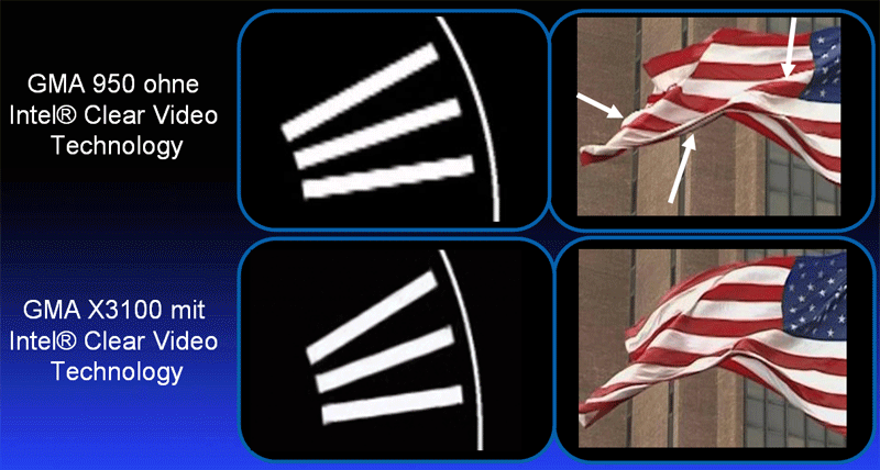 Ebenso wartet der Chip mit einigen Features auf, die Intel unter dem Titel "Clear Video Technology" zusammenfasst. Teil dieses Pakets, das die Darstellungsqualität jeglicher Art von Bild steigern soll, ist ein weiterentwickelter De-Interlacing Algorithmus der die Bildung von Artefakten beim Wiedergeben von Videos und Bildern reduzieren soll. Vor allem im Falle von Bildern ist der Unterschied gut zu erkennen. Ebenfalls unterstützend arbeitet der Grafikchip bei der Dekodierung - also beim Abspielen - von Videomaterial in den Formaten WMV9 und MPEG2.