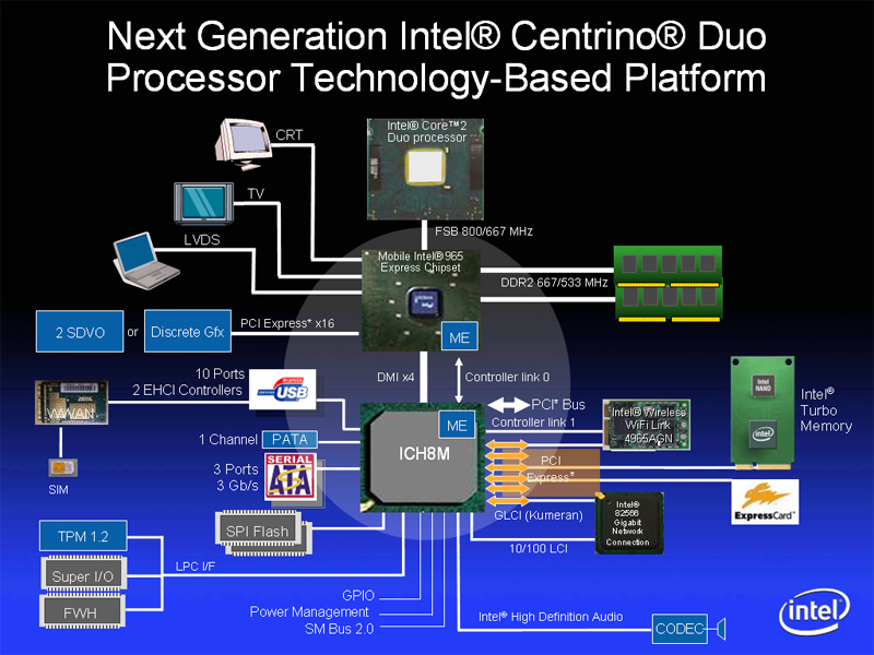 Natürlich macht Centrino Duo vor allem der Chipsatz (Codename: Crestline) aus und über dessen Neuerungen wollen wir nun sprechen. Zuerst sei erwähnt, dass die bereits diskutierten Stromsparmechanismen natürlich auch den Chipsatz betreffen, genauer die hier betrachtete Northbridge mit integrierter Grafikeinheit. Da wir diese aber bereits im vorigen Kapitel ausführlich erwähnt haben, wollen wir nicht noch einmal darauf eingehen, sondern uns den restlichen Neuheiten, wie zum Beispiel dem Grafikchip, zuwenden.