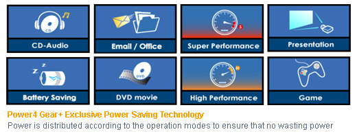 Mittels der Software Asus Power4Gear+ kann außerdem zwischen 8 verschiedenen voreingestellten Energiemodi (s. Bild) gewählt werden - die, je nach Betriebszustand, auf (lange) Akkulaufzeit oder hohe Leistung ausgerichtet sind. Unterwegs macht das Allround-Talent ob des hohen Gewichts und der daraus resultierenden Unhandlichkeit allerdings eine bescheidene Figur - zusammen mit der niedrigen Akkulaufzeit befördert sich der Testkandidat A6JA hier selbst ins Abseits. Allerdings haben wir an dieser Stelle in unserer Bewertung berücksichtigt, dass das Notebook nicht für unterwegs konzipiert wurde und demnach viel mehr als fähiger Desktop-Ersatz angesehen werden kann.
