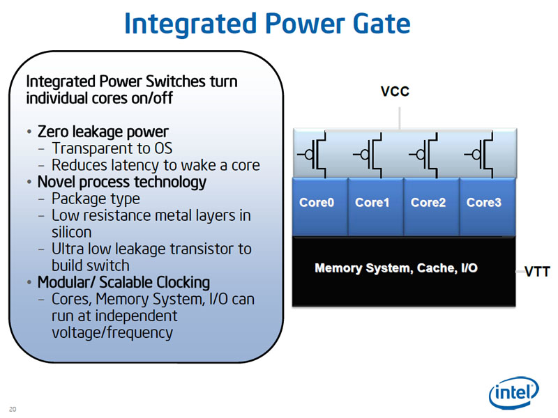 An Bord hat der Nehalem jetzt auch eine Power Control Unit (PCU), welche ausschließlich die Überwachung von Temperatur und Leistungsaufnahme übernimmt. Anders als noch bei vorherigen Prozessoren, kann nun jeder der bis zu vier Kerne mit unterschiedlicher Taktfrequenz angesteuert werden. Die Spannung an den Kernen ist entweder gleichmäßig oder gar nicht vorhanden. Mithilfe eines so genannten "Power Gates" kann jeder Kern einzeln von der Spannungsversorgung abgetrennt werden. Dieser extreme Schlafzustand nennt sich C6-Power-State oder auch Deep Power Down und soll bei geringer Auslastung des Systems für große Einsparungen beim Stromverbrauch sorgen.
