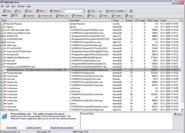 Block vorzufinden, welche eigentlich auch das Haupt von WinTasks darstellen. Prozesse lassen sich per Klick auf die Buttons stoppen bzw. blockieren oder die Priorität kann in vier Stufen (low, normal, high und real-time) erhöht bzw. verringert werden. So lassen sich gezielt Prioritäten für Programme setzen, die mehr oder weniger benötigt werden. Durch eine höhere Priorität lässt sich mehr Geschwindigkeit für den entsprechenden Tasks erreichen. Dies ist vor allem gut, wenn mehrere Programmen gleichzeitig zu Arbeit benötigt werden. Die Block-Funktion ist ebenfalls durchaus praktisch. Denn um sicher zu gehen, dass unerwünschte Programme auch nicht wieder von Windows gestartet werden, können jene je nach Belieben auf die Block List gesetzt werden. Weiterhin wurde in WinTasks auch eine Update-Funktion integriert. Denn da täglich neue Programme auf den Markt kommen, muss auch die Prozess Bibliothek dementsprechend oft aktualisiert werden, damit Programme eindeutig identifiziert werden können. Die Aktualisierung der Bibliothek dauert zum Glück keine Ewigkeit und ist meist in einer Minute beendet - mit ISDN wohlgemerkt.