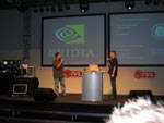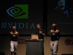 Die mehr oder weniger auch für den herkömmlichen Besucher einsichtige Pressekonferenz beinhaltete zum Einen die offizielle Produktvorstellung der GeForce 6600 Serie und zum Anderen das Auftreten einiger Nvidia-Partner aus der Software- und Spielebranche. Besonders hervorheben möchten wir an dieser Stelle Mark Rein von Epic, welcher einen Einblick in den aktuellen Stand der Unreal Engine 3 bot. Zu diesem Zweck zeigte man einige Szenen aus gerenderten Außenleveln, Charaktären und den neuen Unreal Editor. Und all dies geschah direkt auf einem lauffähigen SLI-System von Hersteller Atelco. Wir haben kurzer Hand einen kleinen Mitschnitt mit unserer Digitalkamera erstellt, auch wenn die Qualität nicht gerade berauschend ist (